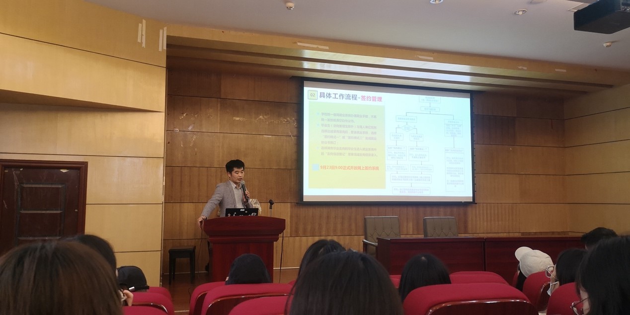 紧接着,陈龙介绍了学校毕业就业网上系统的使用方法和操作流程,针对同学们非常关心的择业流程、签约时间、相关政策及注意事项进行了详细的讲解,并配合着PPT为同学们细致清晰地梳理了重要的时间节点和关键的网上系统使用步骤。