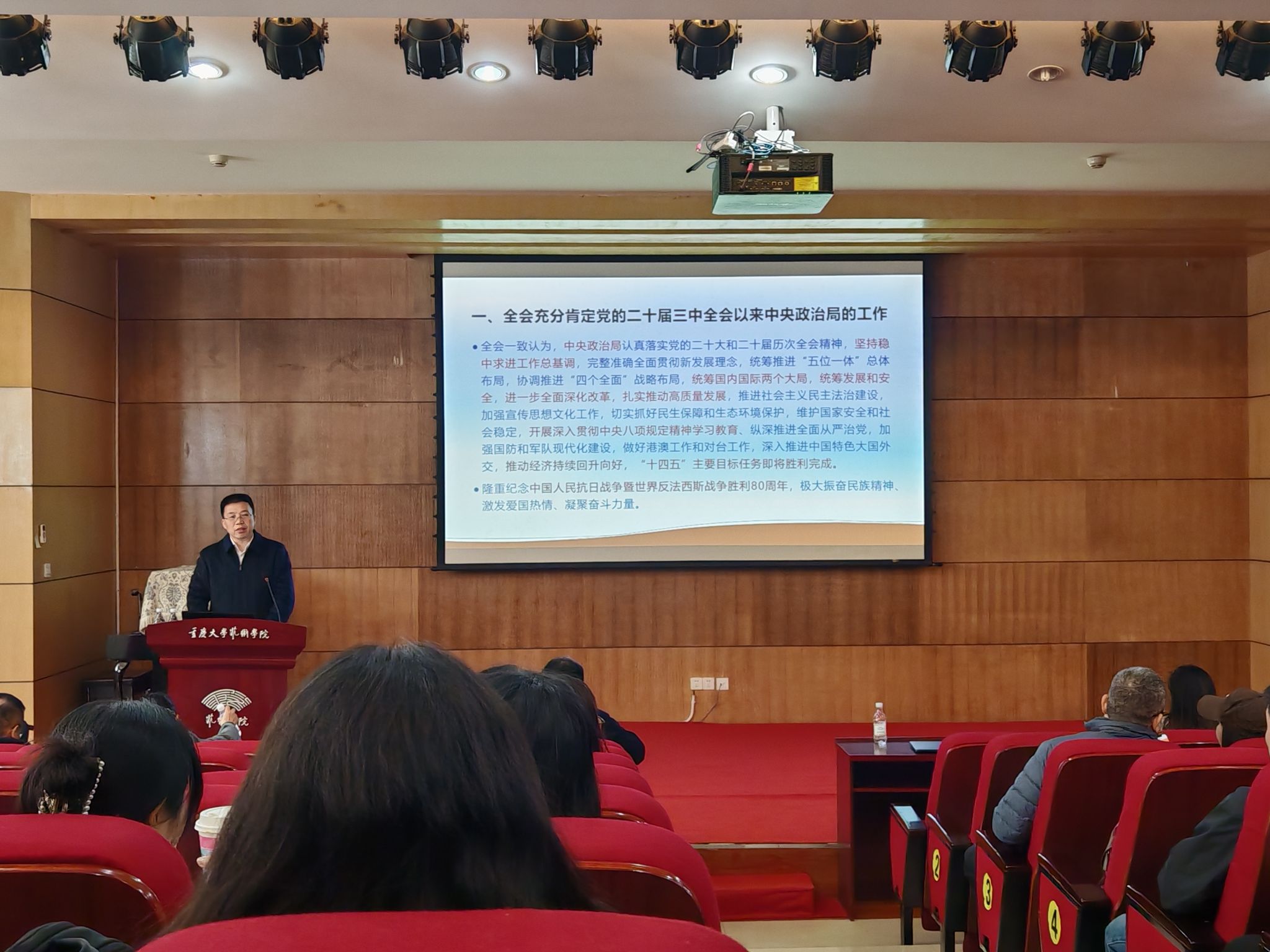 蒋华林对《中国共产党第二十届中央委员会第四次全体会议公报》《习近平关于〈中共中央关于制定国民经济和社会发展第十五个五年规划的建议〉的说明》《中共中央关于制定国民经济和社会发展第十五个五年规划的建议》的主要内容作了宣讲。蒋华林强调,党的二十届四中全会是在以中国式现代化全面推进强国建设、民族复兴伟业的关键时期,召开的一次具有承前启后重要地位的、具有里程碑意义的重要会议。学习好、贯彻好全会精神是当前和今后一个时期学院的重大政治任务。要按照《中共重庆大学委员会学习宣传贯彻党的二十届四中全会精神工作方案》,通过教职工政治理论学习会、党支部“三会一课”、团日活动、班会、读书会等形式抓好专题学习研讨,掀起学习热潮,准确把握全会精神实质,把思想和行动统一到党中央的决策部署上来,对表到学校党委工作要求上来,落实到服务支撑“百年新重大”建设目标任务上来。结合学院实际,主动担当、真抓实干,扎实抓好“十四五”收官、“十五五”谋划和党的建设、人才培养、科研创新、学院校区搬迁、安全稳定等各方面工作,推动学院在“十五五”时期再上新台阶。