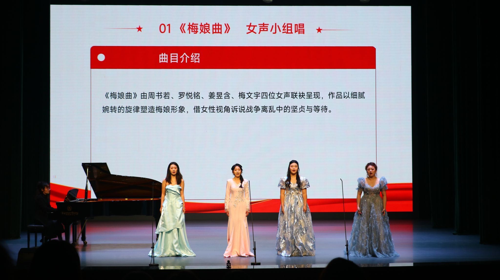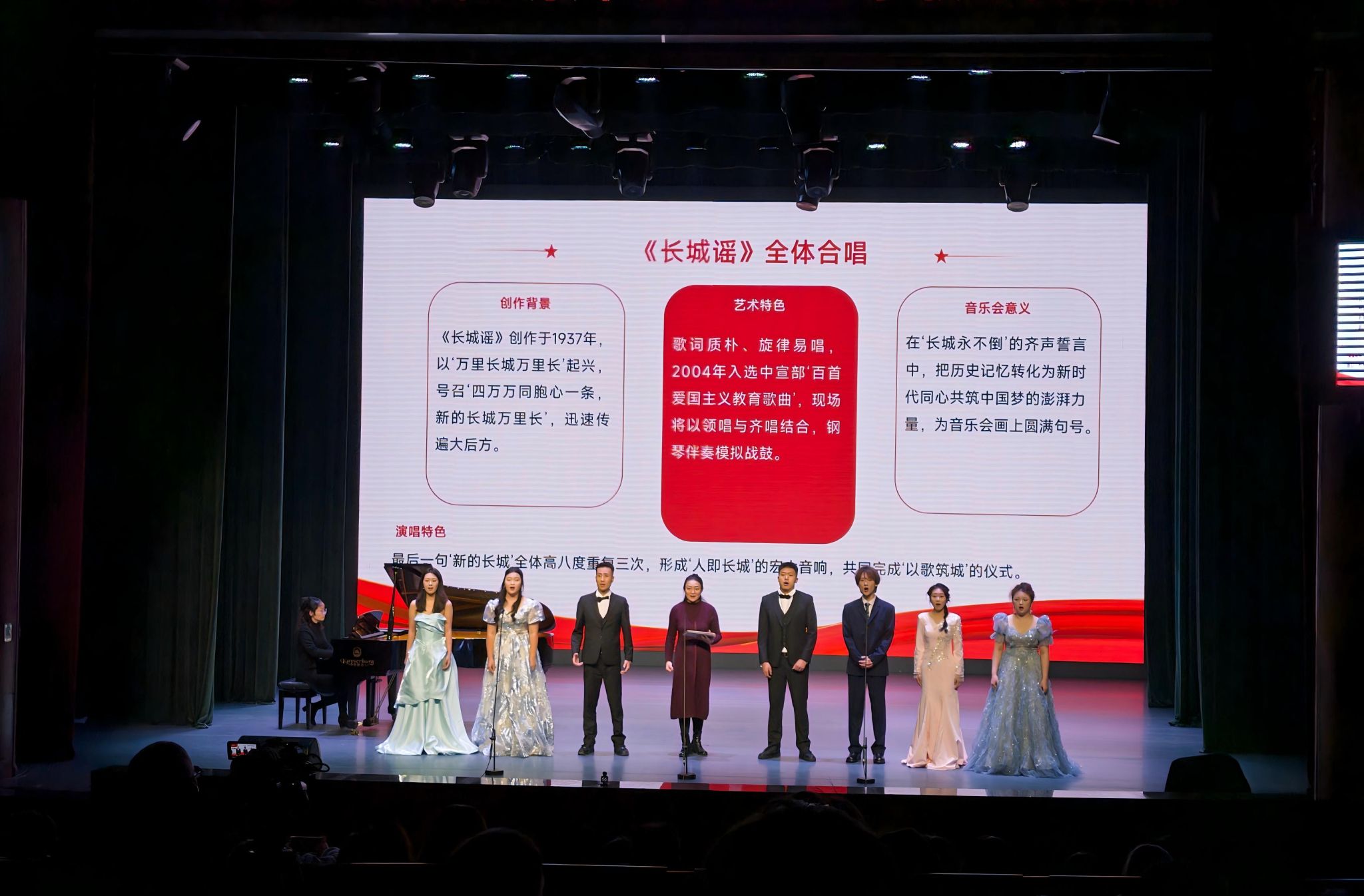 音乐系主任喻思言统筹策划,音乐系党支部副书记、声乐教师袁筱璇担任声乐指导与分享人,音乐系钢琴教师周珏担任钢琴艺术指导。音乐会以刘雪庵《长城谣》为线索,循着抗战大后方的文化脉络展开,以“讲述+演唱”的形式串联历史、融通艺术。袁筱璇在曲目介绍中从时代背景、作曲语言、人物情感切入,引导观众在音乐之美中聆听时代回声,让每一首作品既是歌曲,更是一段被重新点亮的记忆。
