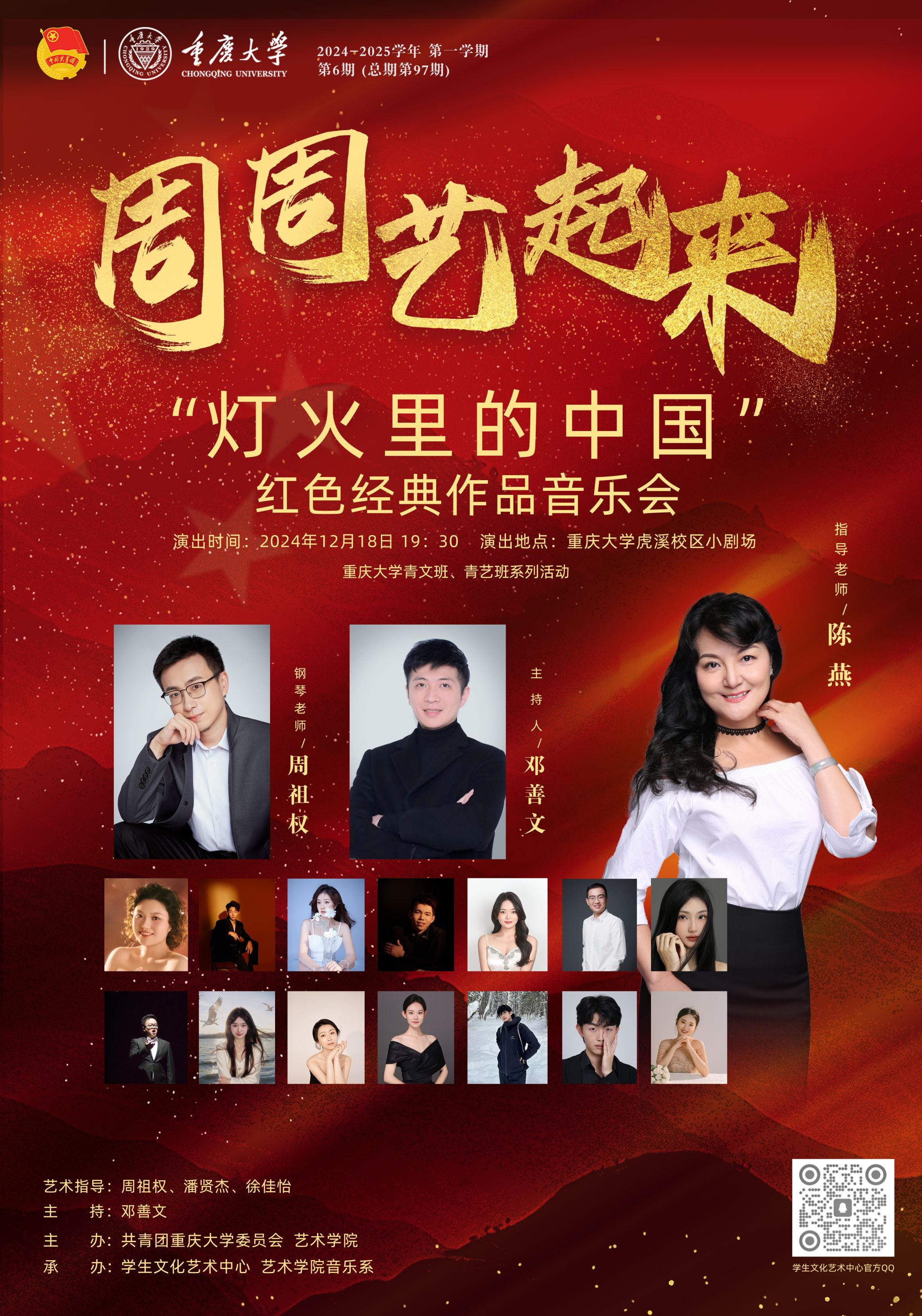 2024年12月18日晚7:30,“灯火里的中国”——红色经典作品音乐会在重庆大学虎溪校区小剧场举办。此次活动系共青团重庆大学委员会和英超联赛 主办,校团委学生文化艺术中心和英超联赛 音乐系承办的“周周艺起来”系列艺术活动之一,参演人员为音乐系陈燕教授教学班学生及教学班已毕业的优秀校友。“灯火里的中国”音乐会为厚植爱国主义情怀,让其在校园中蔚然成风;为传承红色经典文化,使红色基因在历史的脉络中赓续绵延;为绘就...