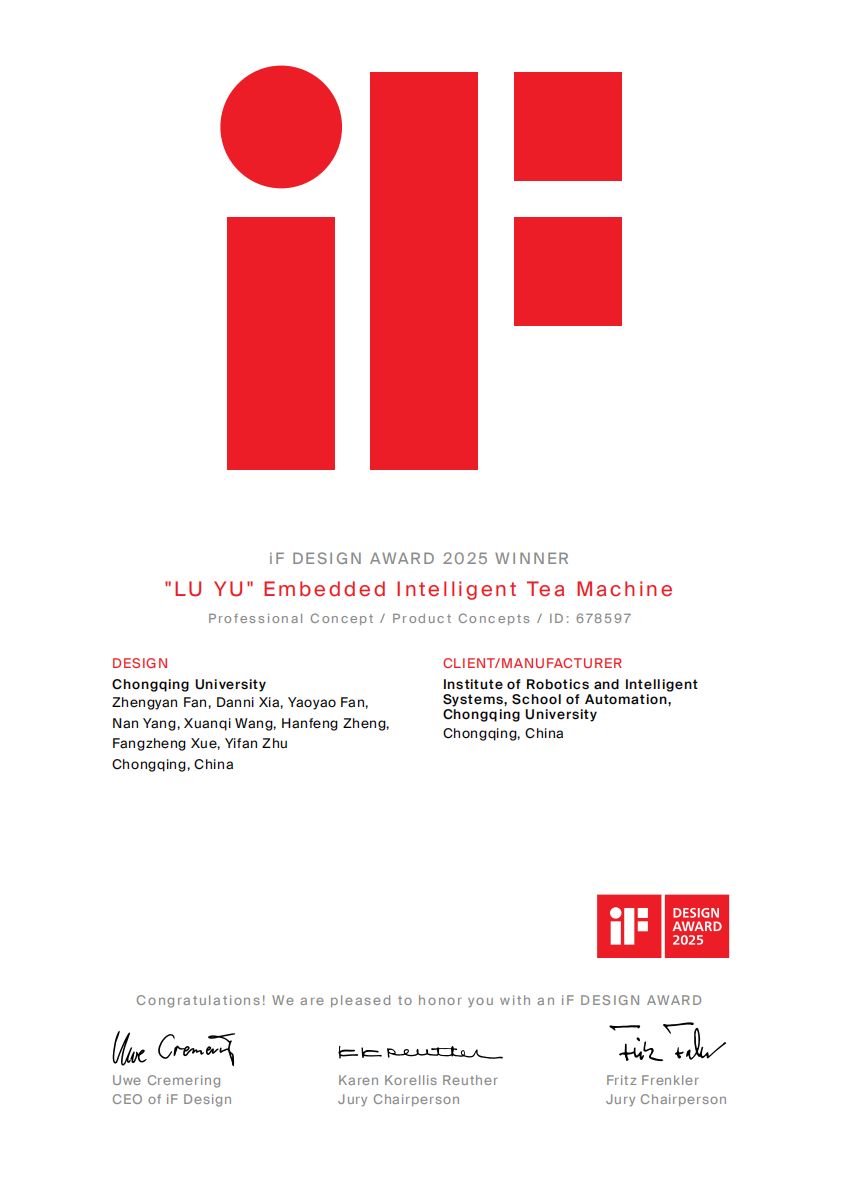 近日,2025德国iF设计奖获奖名单正式公布,英超联赛 设计学系范正妍副教授团队(成员包括夏丹妮、范遥瑶、杨楠、王轩麒、郑汉风)与重庆大学自动化学院机器人与智能系统研究所薛方正教授团队共同组建跨学科组合,凭借作品《“LU YU” Embedded Intelligent Tea Machine》,从全球上万件参赛作品中脱颖而出荣获该奖项,并受邀参与4月在德国柏林举行的颁奖典礼。此次获奖印证了设计学科“价值-能力-实践”为一体的跨学科...